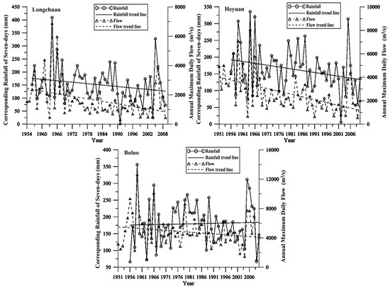 It would be important to understand the possible reasons for selecting different distributions. As rainfall is the primary source of streamflow in the study basin, the possible relationship between annual maximum streamflow and corresponding basin rainfall in the past 7 days was investigated. For Longchuan and Heyuan Stations, the flood series and the corresponding rainfall series are consistent with decreasing trend for both series, and for flood series the trend is statistically significant at the 0.05 level (Table 4), while the decreasing trend for the rainfall series is not significant at the 0.05 level (Figure 4). For Boluo Station, the flood series and the corresponding rainfall series are inconsistent with an increasing trend for rainfall series but a slightly decreasing trend for the flood series (Figure 4), meaning that the effect of rainfall on the flood is weakening. As a possible consequence, the Cs values of the peak flood series exhibit a decreasing trend from upstream to downstream, which may be caused by the variation of rainfall, urbanization activities and basin reservoir regulation storage. Due to the enhancing degree of human influence from upstream to downstream, the sensitivity of the stream flow to climate fluctuation gradually reduces from upstream to downstream in East River basin.