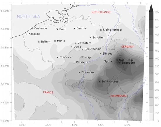 Belgium (Figure 1) is mainly influenced by a temperate oceanic climate, implying that precipitation occurs year round. Prevailing winds from the South-West are responsible for the advection of moist air from the North–Atlantic Ocean and thus for most of precipitation events. Belgium is divided into three orographic zones regarding to elevation above sea level (z): Low-Belgium (z < 100 m), Middle-Belgium (100 m < z < 300 m) and High-Belgium (z > 300 m) with a highest point at 694 m above sea level. In Low and Middle-Belgium mean precipitation amount of 700–800 mm/year is measured, while precipitation amount can reach more than 1400 mm/year on the summits of Belgium [,]. Thunderstorms mainly occur between April and September, often originate from the South–West and are the most frequent in High–Belgium [].