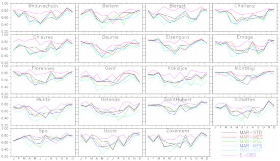 At the monthly scale (Figure 2), MAR-STD underestimates precipitation year round for all stations except in summer at some stations (e.g., Beauvechain, Schaffen, Spa). This is the opposite situation for MAR-NTK with almost always positive or close-to-zero biases all around the year for most stations. MAR-BMJ, MAR-MES and MAR-KFS have a weak bias in winter but they overestimate precipitation in summer.