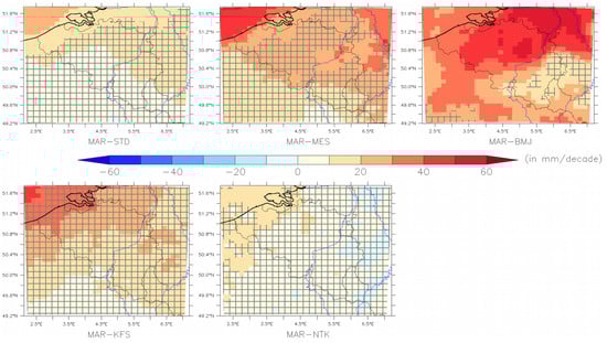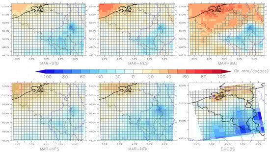 According to MAR, the annual precipitation amount (Figure 5 and Figure S4) does not show any significant trend over Belgium except over the North Sea where a significant increase (+20 to +60 mm/decade) is simulated in MAR-STD, MAR-MES and MAR-BMJ (which also shows a significant trend over the northern half of Belgium). Although E-OBS have no information over the sea pixels, the nearest shore grid points also reveal a positive trend (+30 mm/decade) even if it is not significant. On the other hand, the E-OBS data show a significant decreasing trend over High Belgium (−50 to −80 mm/decade) and the surrounding regions to the east and to the south. The five MAR experiments suggest a non-significant decreasing trend in High Belgium.
