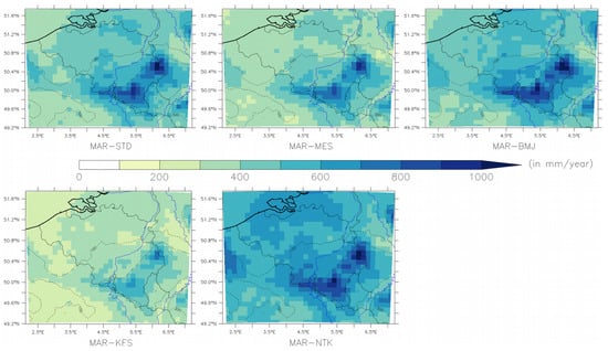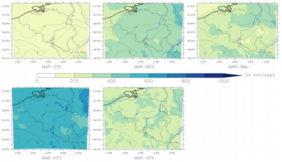 MAR-STD and MAR-MES fit slightly better the observations as well as the E-OBS data, most likely because the STD and MES schemes are the original convective schemes used in the MAR model, whose compensation for unknown errors (inherent to any climate model) is itself calibrated on the original MAR configuration. In contrast, MAR-NTK shows the largest total annual precipitation, probably because this convective scheme was originally developed for a GCM and particularly for the equatorial region []. Zhang et al. [] adapted this scheme for a RCM but they recognize that it produced more intense shallow convection and thus leads to more precipitation than other convective schemes such as BMJ. In general, each convective scheme has particular parameters or reference profiles for BMJ, defined by the authors in order to have the best results with their models for a specific configuration. Even if certain studies tried to have experimental results reproducible as written by Janjić [], it is normal that results change when using another model than the experimental one. As introduced in Section 2.3, results clearly show that no convective scheme performs systematically better than the others and that the results are extremely dependent on the internal configuration of the model [,]. Despite these individual results, all experiments show that the trends are similar, which suggests that it would be interesting to use all these experiments as part of a model ensemble, as already proposed by Pieri et al. [] and Cortéz-Hernàndez et al. [].