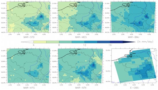 All MAR simulations (except MAR-KFS) are in agreement with the average 95th percentile from the E-OBS data for High Belgium over 1987–2017 (Figure 9) with values between 13 and 16 mm/day while MAR-KFS simulates lower percentiles. For Low and Medium Belgium, MAR-STD underestimates the 95th percentile, while MAR-MES, MAR-KFS and MAR-NTK compare better. The best agreement occurs with MAR-BMJ.