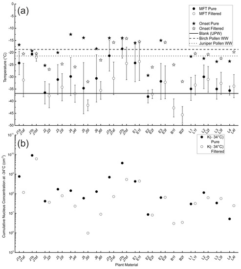 We analyzed two different black currant juices (J1a and J1b), with J1a showing a reduced INP concentration, as well as reduced onset temperature and MFT. Sea buckthorn, of which four samples (two juices (J7a and b) and aqueous extracts of the dried berries (E3) and of leaves (L4)) were analyzed, behaved similarly. While the freezing temperature of the black currant as well as the sea buckthorn juices varied (see Figure 2), the curve progression of their cumulative nucleus concentration against temperature plots are similar, but shifted in their concentration (see Figure 3). This indicates that in different analyzed samples of a species for both cases, same or similar INP are present, however, in varying concentration. Interestingly, filtration impacted the two chosen juices differently in both cases. The juices marked with an a showed a higher loss in INP concentration than the juices marked with a b.