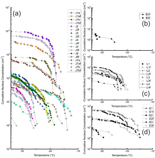 (1) Mean freezing temperatures ranged from −18.5 to −45.6 °C; cumulative nucleus concentrations between −12 and −34 °C ranged from 9.7 × 105 to 9.2 × 109 cm−3. The onset temperatures of most samples match the literature values for plant derived INP well. The authors would like to highlight black currant, which contains potent INP and exhibited the highest concentrations. To the knowledge of the authors, it was not previously known to act as possible source of INP.