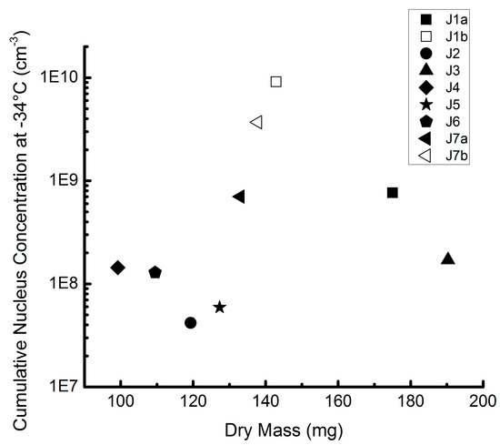 We further looked at the role of the dry mass on the number of contained INP in unfiltered juices. Dry mass refers to the weight of residues of dried samples, given in mg/mL (dry mass/mL sample dried) and it varied strongly between the different samples. To investigate if differences in the INP concentrations are related to differences in the dry mass concentrations, we plotted different mass concentrations of all nine unfiltered juice samples against the number of INP active at or above −34 °C (see Figure 4). There is no correlation between dry mass and INP content (a linear fit yields an R2 value of 0.0124; not shown). This means that the concertation of INP is not a function of the dry mass of the sample, i.e., different plants contain different amounts of INP.