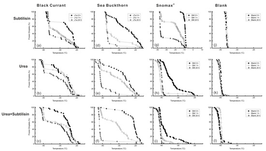 Black currant (J1a) and sea buckthorn juice (J7a) were treated with urea, subtilisin, and a combination of both reagents, to get information on the importance of proteins and their structural integrity on the INA of those juices. Figure 5 shows the effects of the three different treatment methods (see Table 2) on black currant juice (J1a) and sea buckthorn juice (J7a). Both juices were highly affected by subtilisin alone and lost the majority of their activity (Figure 5a,d). In the case of black currant (J1a) the INA was halved after 24 h of treatment (Figure 5a). For sea buckthorn (J7a) we found an even stronger decrease with less than 20% of droplets containing INP after 24 h of treatment (Figure 5d). Urea had a less drastic effect on black currant (J1a) than the subtilisin treatment. Approx. 90% of the droplets analyzed from the untreated sample froze heterogeneously. After 24 h of treatment with urea alone at 60 °C still more than 60% heterogeneously freezing droplets remained (see Figure 5b). Sea buckthorn (J7a) on the other hand again lost the majority of its INA, with approx. 20 % of droplets freezing heterogeneously after 24 h of treatment (see Figure 5e). When urea and subtilisin are used together, the effect on black currant (J1a) is drastically smaller than when treated with subtilisin alone (see Figure 5c). The resulting curve after 24 h is comparable to the one obtained when black currant is treated with urea alone, only the initial loss (after 1 h) is higher in the presence of subtilisin. Sea buckthorn (J7a), which was more strongly affected by urea than black currant (J1a), nearly lost all of its INA after 24 h of treatment (see Figure 5f). After 1 h and after 24 h, the activity of the urea and subtilisin treated sea buckthorn is slightly lower than the activity of the sea buckthorn sample treated with urea alone.