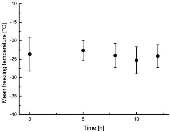 Black currant juice was treated with 1–10 mL/s of air containing approx. 0.01% ozone for 12 h. Ozone is a strong gas phase oxidizer, which is prone to test for the robustness of the INP against oxidation. Therefore the results of this test give an idea on the stability of black currant juice (J1b) towards atmospheric oxidation. The results of the ozone treatment are shown in Figure 6 represented as mean freezing temperatures. We found no significant change in the freezing temperature in the 12 h of treatment, indicating that the INA of black currant juice is not affected by ozone. The juice however did lose all of its color during the oxidation process.
