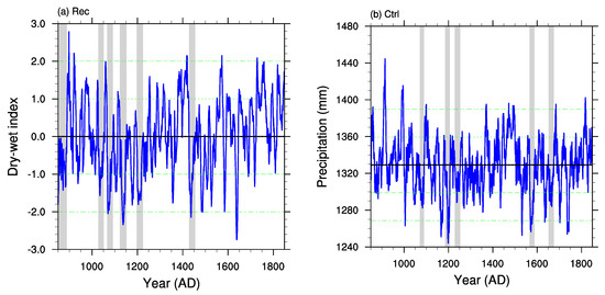 In this study, the time series of the reconstructed dry–wet index averaged over eastern China (25° N–40° N, 105° E–122° E) during the period of 850–1850 were used to estimate the observed variations in historical megadrought events. This data was reconstructed based on Chinese historical documents and instrument measurements [24]. This data is published as 10-year running mean. Thus, to be consistent with the reconstruction data, eastern China is selected as the study area in the CESM (25° N–40° N, 105° E–122° E), which is a typical monsoon region with a rainy season mainly extending from May to October [44]. The monsoon precipitation accounts for about 70% of annual total precipitation (Figure S1). The gridded reconstructed Palmer Drought Severity Index (PDSI) data [23] were also used to show the spatial patterns of megadroughts.