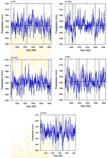 Figure 1 compares the time series of the simulated regional precipitation with the reconstructed wet–dry index over eastern China. There are six megadroughts (marked in gray) in the reconstruction data (Figure 1a), while there are five megadroughts in the control run (Figure 1b) and 3–6 megadroughts in the forced runs (Figure 1c–g). Previous studies [45] have shown that CESM broadly reproduces the observed EASM and EASM-precipitation relationship with some small biases. Recall a megadrought event is defined as a period with precipitation anomalies less than zero for at least 20 consecutive years, and those drought events that do not persist for 20 years are not considered megadrought events in this study. There is little or no agreement in the timing between the reconstructed megadroughts and simulated megadroughts, either from the control run or forced runs. Moreover, the identified megadroughts among different sensitivity experiments or different members within the same group of sensitivity experiments are also inconsistent. The disagreement in the megadrought timing and magnitudes indicates that the major triggering mechanism of megadroughts is the internal climate variability.
