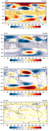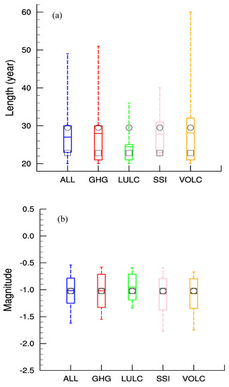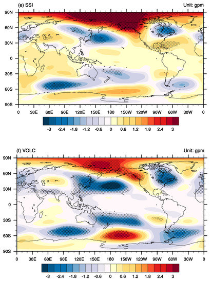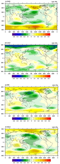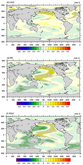 Therefore, different from some previous studies that found no compelling evidence for an important and consistent role played by the external forcing in driving the simulated hydroclimate variability on decadal time scales [42], the megadroughts over eastern China are influenced by external forcings, especially for durations and spatial distributions. As found in other studies [58], the external forcings exert influences by changing the variability of the internal climate patterns existing in the CTRL run, such as the tripolar SST anomaly pattern. However, the responses of the climate system to the external forcings are different; for example, the responses to the LULC are usually smaller than the other forcings. Another interesting phenomenon is that for volcanic eruptions that usually show influences on interannual scales, these volcanic eruptions still show some influences on a multi-decadal scale, which is similar to findings of previous studies [36].