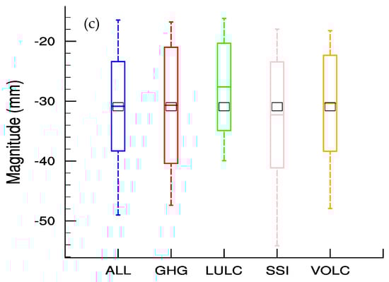 Comparison between reconstructed (black circle) and simulated megadrought lengths ((a), unit: day), standardized magnitude ((b), unit: 1), and absolute magnitude ((c), unit: mm) from the control (CTRL) run (black square), all-forcing (ALL) runs (blue), greenhouse gases (GHGs) runs (red), land use and land cover (LULC) runs (green), spectral solar irradiance (SSI) runs (pink), and volcanic eruption (VOLC) runs (orange). The boxes indicate the 25th and 75th percentiles of the distributions. The bars within the boxes indicate mean values. The whiskers indicate the full range of the distributions.