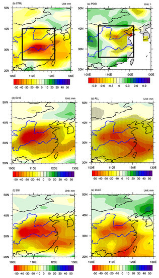 Simulated ensemble-averaged annual precipitation anomalies during the megadrought years over eastern China (unit: mm) from the long-term means of the Palmer Drought Severity Index (PDSI) (a), control (CTRL) run (b), all-forcing (ALL) runs (c), greenhouse gas (GHG) runs (d), land use and land cover (LULC) runs (e), spectral solar irradiance (SSI) runs (f), spectral solar and volcanic eruption (VOLC) runs (g). Stippling indicates differences significant at the p = 0.05 level based on a t-test. The black rectangle indicates the location of the study region. The blue lines indicate the locations of Yellow River (upper blue line) and Yangtze River (lower blue line).