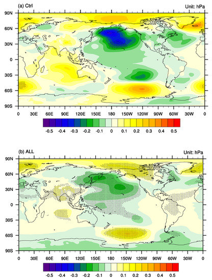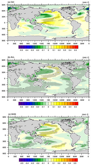 The spatial patterns of the SST anomalies (Figure 7) show that there is a tripolar pattern with significant negative SST anomalies over the northwestern Pacific, similar to the positive PDO pattern and other similar decadal scale patterns [12]. However, this SST anomaly pattern is not exactly the same as the typical PDO pattern [51,52] because the negative SST anomalies extend to the South China Sea and eastern Indian Ocean. Moreover, surrounding the negative SST anomalies, there are positive SST anomalies over the Bering Sea and the western tropical Pacific, creating a La Niña-like SST gradient over the tropical Pacific, indicating the potential model biases on reproducing spatial patterns of internal climate variability. These SST patterns can be considered an internal mode in the model simulations, which represents the multi-decadal variability extracted using the rotated empirical orthogonal function (REOF) analysis with the first 10 empirical orthogonal function (EOF) patterns retained, which is applied to both the CTRL and ALL experiments (Figure 8). All of the first 3 EOF patterns of both experiments are significantly separated based on North’s Rule of Thumb. On the other hand, this SST anomaly pattern bears similarity to the SST anomaly pattern associated with the multi-decadal variation of the EASM land precipitation, derived using the instrumental data (1901–2016) of Li and Wang [32]. The similarity includes opposing SST anomalies between the WNP and those over the equatorial western Pacific and Bering Sea; however, the difference is in the equatorial eastern Pacific.
