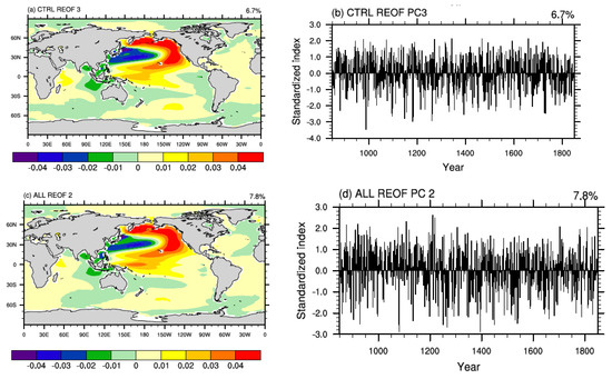 The third/second rotated empirical orthogonal function (REOF) spatial patterns and principle components of the global sea surface temperature (SST) from control (CTRL) (a,b) and all-forcing (ALL) (c,d) experiments.