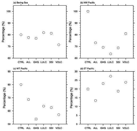 First, to confirm the influences on the megadrought persistence from the SST pattern, four characteristic SST regions were identified, i.e., the Bering Sea (50° N–65° N, 160° E–160° W), the northwestern Pacific (20° N–45° N, 140° E–160° W), the western tropical Pacific (10° S–10° N, 140° E–170° W), and the eastern tropical Pacific (10° S–10° N, 130° W–80° W). A time series of the regional-averaged SST anomalies is considered to be significantly persistent if the lag-1 autocorrelation exceeds , where N is the number of years in the time series [54,55]. Based on this method, the percentages of significantly persistent SST anomalies over the four regions relative to the total megadrought events in each experiment are represented in Figure 9. Most of the SST anomalies over the Bering Sea (Figure 9a) and the northwestern Pacific (Figure 9b) and more than half of the SST anomalies over the western tropical Pacific (Figure 9c) significantly persist through the megadrought periods; however, less than 30% of the SST anomalies over the eastern tropical Pacific significantly persist through the megadrought periods (Figure 9d). Thus, the SST anomalies over the Bering Sea, the northwestern Pacific and the western tropical Pacific are the key regions influencing the persistence of the megadroughts.