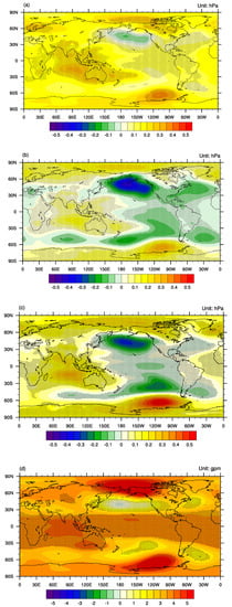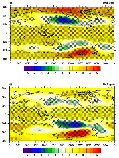 The regression patterns of the 500 hPa geopotential height anomalies show (Figure 10d–f) that the strongest responses to the SST anomalies over all three key regions are located over the northern Pacific with negative geopotential height anomalies, while over the tropical to mid-latitude regions, there are mainly positive geopotential height anomalies. This is consistent with the results from the previous composite analyses in which the geopotential height anomalies over the northern Pacific are more significant than in other areas, and the SLP anomalies are more significant than the 500 hPa geopotential height anomalies. This indicates that the anomalous cyclonic circulation patterns over the subtropical western Pacific mainly exist over the lower troposphere.