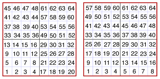 Example of rank reordering for a 4 node (2 × 2 2D node decomposition) simulation with 16 cores (4 × 4 2D core decomposition) per node. Numbers indicate MPI rank, starting at 1, for each communicator. Initially (left image, communicator MPI_COMM_WORLD) ranks are ordered in “SMP” mode where each subsequent node is populated with ranks in ascending order. Following rank reordering (right image, new MPI_COMM_CM1 communicator), nodes/ranks are mapped to the physical horizontal model domain (each rank contains the full vertical extent of the physical model domain). The lowest numbered rank on each node collects, assembles, compresses, buffers to memory, and writes to disk.