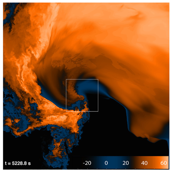 The simulation was run on an isotropic mesh with a grid spacing of 10 m, in a box spanning 112 km by 112 km by 20 km (using , or 250,880,000,000, grid points). A model time step of 0.04 s was used to maintain stability, and a short time step of 0.01 s was used for the acoustic time step. The chosen time step is smaller than what was necessary for computational stability due to aliasing; however, a larger time step resulted in sporadic failure of CM1’s saturation adjustment scheme, which is iterative, to converge, causing the model to abort. The remaining model parameters were identical to those of [17] with the exception that the TKE closure option of Deardorff et al. [35] was used in place of that of Smagorinsky [36], and the fully explicit pressure solver was used (psolver=2).