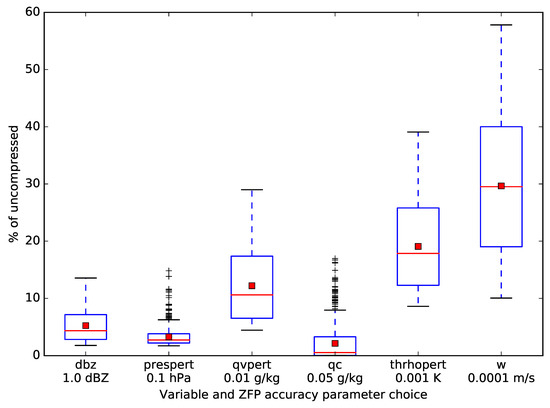 A Tukey [34] box and whiskers plot of compression performance statistics (in terms of percentage of uncompressed size) of six of the saved variables within the 676 files spanning the full saved subdomain, which is roughly centered on the tornado. The red line represents the median value, the red square the mean value, while the box contains the interquartile range (IQR) and the whiskers are located at 1.5 times the IQR. Outliers are plotted with the ‘+’ symbol. The accuracy parameter chosen at runtime is noted below each of the 3D variables names. Larger (smaller) values of the accuracy parameter would have resulted in smaller (larger) file sizes. Variables displayed are simulated reflectivity (dbz, in dBZ), perturbation pressure (prespert, in hPa), perturbation water vapor mixing ratio (qvpert, in g/kg), liquid cloud water mixing ratio (qc, in g/kg), perturbation density potential temperature (thrhopert, in K) and vertical wind speed (w, in m/s). The mean compression performance for the shown variables is 11.9% of uncompressed, or a compression ratio of 8.4:1.