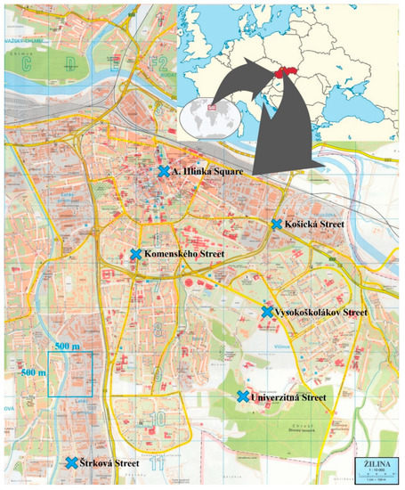 A proposal for a network for air quality measurements was created in Žilina city, Slovakia. The layout of the measurement sites was chosen based on the idea of covering typical functional urban areas (city center, industry zone, traffic hubs, and living zone) (Figure 1). Measuring points are always a combination of several sources of air pollution.