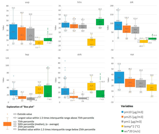 “Box plot” showing the concentration of particulate matter and meteorological parameters during air quality measurements in Žilina city (temp—temperature, ws—wind speed).