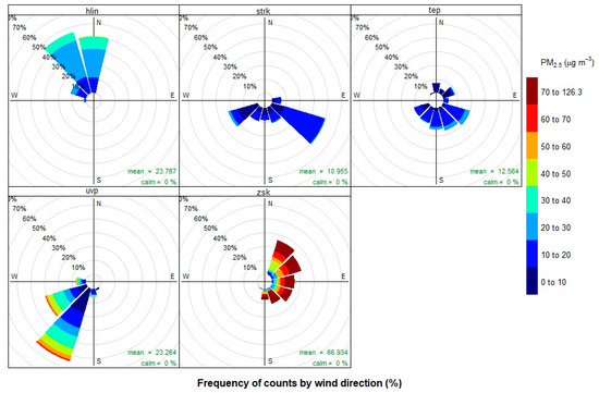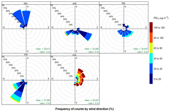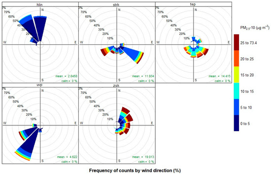 We can observe the largest concentrations of fine PM2.5 fraction at the Komenského Street measuring station from the northeast, east, and southeast (Figure 3). Depending on the monitoring station location, these concentrations are from the road (street), which is located east in a south–north direction. Higher PM2.5 concentrations were most evident in connection with wind directions from the roadside in the case of the Komenského Street measuring station. The coarse PM2.5-10 fraction was most evident in connection with wind directions from the roadside at the measuring stations on Košická Street and Štrková Street (Figure 4). The total PM10 fraction is mainly influenced by its major fraction—PM2.5 or PM2.5-10 (Figure 5). The proportion of fine fraction PM2.5 is significantly lower at the measuring stations on Košická Street and Štrková Street.