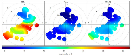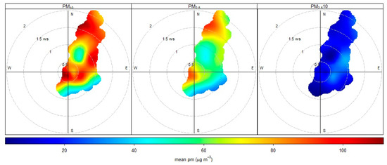 The hourly data were measured using an optical method: the particulate matter concentrations, the wind speed, and the wind direction, were used to obtain the concentration rises by statistical software “R” and open-source tool “Openair” (Figure 3, Figure 4 and Figure 5). Pollution rose is a variant of wind rose, which is useful for considering pollutant concentrations by wind direction (hourly concentrations-counts) or, more specifically, the percentage of time the concentration is in a particular range.