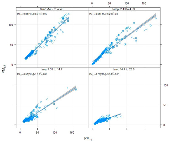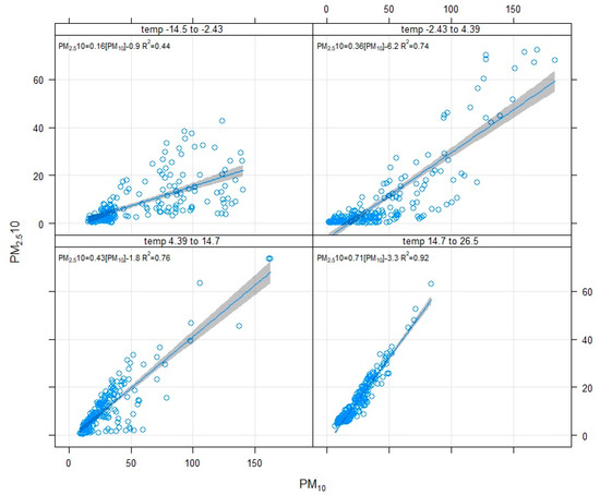 The relationship between fine fraction PM2.5 and total fraction PM10 was evaluated from all measured data (all measurement stations), as well as the relationship between the course fraction PM2.5-10 and the total fraction PM10. Using scatter plots and regression analysis (MRA), we can observe a very significant relationship between PM2.5 and PM10, especially at low temperatures (Figure 8). The fine fraction PM2.5 is dominant at low temperatures (from −14.5 to −2.43 °C), and we can describe up to 95% of the original data using the model.