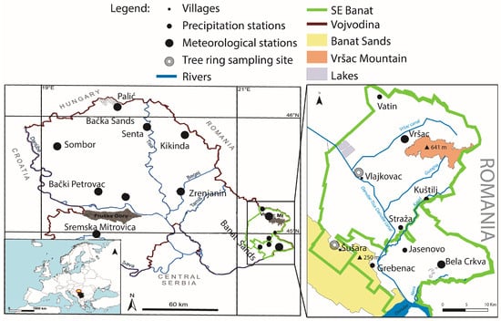 Territories of Vojvodina and SE Banat, their locations in Serbia and Europe, meteorological stations and tree ring sampling site used in this study.