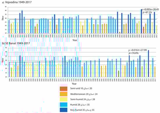 The distribution of the mean annual De Martonne Aridity Index, IaDM, and its trend for the Vojvodina region and SE Banat region, during the period 1949–2017, are presented in Figure 2.