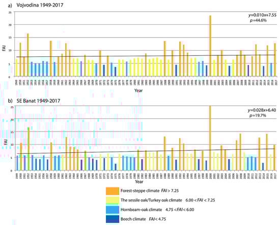 The distribution and trend of the mean annual Forestry Aridity Index, FAI, for (a) Vojvodina and (b) SE Banat both for the period 1949–2017. The aridity trend is presented with a solid, black line and trend equation, and p is the probability.
