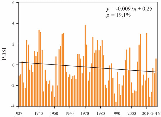 where Xt and Xt-1 are PDSI values for the actual and previous month, respectively. The p (0.897) and q (1/3) are coefficients or duration factors, demonstrating how sensitive the PDSI is to the monthly moisture anomaly Zt and how much autocorrelation the PDSI has. The detailed calculation of PDSI can be found in Palmer [] and Dai [].