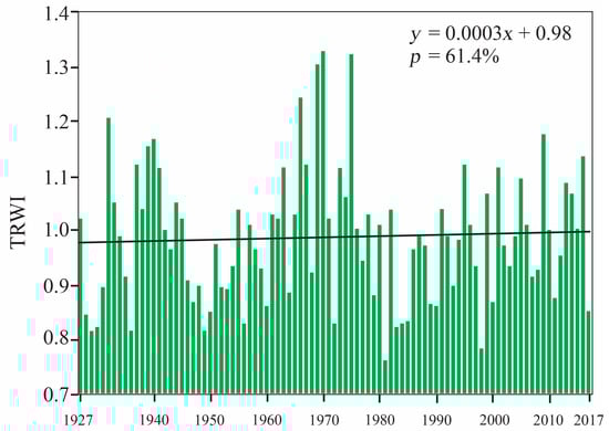 The distribution and trend of the TRWI for SE Banat in the period 1927–2017. The TRWI trend is presented with a solid, black line and trend equation, and p is the probability.