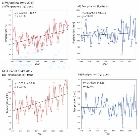 The distributions and trends of the mean annual temperature, Ta, and the mean annual amount precipitation, Pa, in the period 1949–2017, for (a) Vojvodina and (b) SE Banat, respectively. Trends of the Ta and the Pa are presented with solid, black lines and trend equations, and p are probabilities.