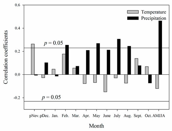 The statistical characteristics of our standardized chronology are summarized in Table 3. Beginning in 1920, the EPS value for ring width was greater than 0.85. The mean inter-series correlation coefficient was 0.40, indicating a sensitive measurement series where the tree ring samples contained a high degree of common climatic signals [], and can therefore provide useful information on climate change in the location being studied.