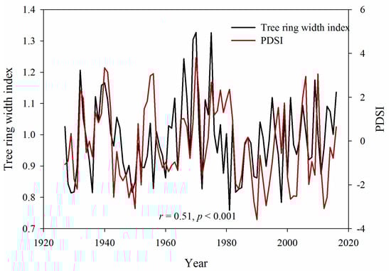 Comparisons between the TRWI and the PDSI during April–August for SE Banat from 1927 to 2016, where r is the coefficient of correlation and p is the significance level.