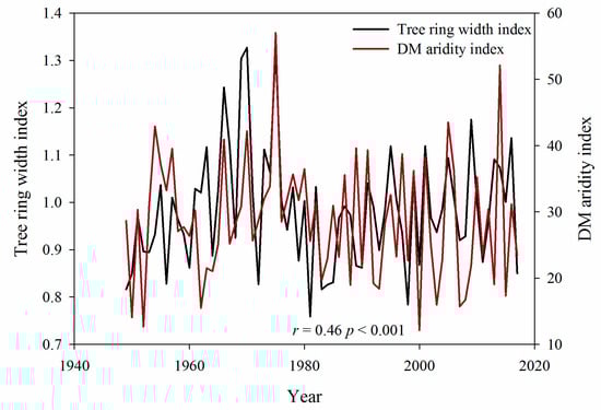 Comparisons between the Tree Ring Width Index and the DM Aridity Index during April–August for SE Banat from 1949 to 2017, where r is the coefficient of correlation and p is the significance level.