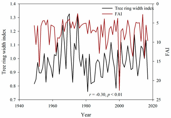 The TRWI shows a satisfactory correlation between the PDSI (r = 0.51, p < 0.001, Figure 8) and the ImDM (r = 0.46, p < 0.001, Figure 9), from April to August, suggesting that the linear dependence reflected by the index is relatively high, despite the index values being the result of highly nonlinear processes, while the TRWI shows negative and weak correlation with FAI (r = –0.30, p < 0.010) (Figure 10).