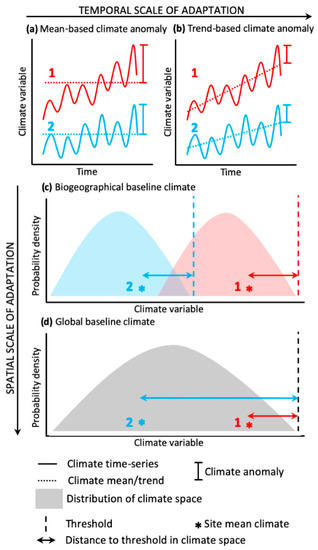 Conceptual framework of alternative effects of climate anomalies on ecosystems given baseline climate and recent climate change. (a) Climate anomalies are often measured as the difference between the mean baseline climate and the climatic condition at the anomaly (vertical lines). (b) To account for recent adaptations to climate change that could occur via change in community composition [20,21] (leading to resilience to the climate stressor), we can describe the anomaly as the difference between the recent climate trend and the climate conditions during the extreme climate event, i.e., the residuals from the trend line. (c) The physiological threshold (dashed line) for a given community might depend on the region where that community evolved and adapted [24]. If so, the physiological threshold can be defined regionally (considering adaptations to regional conditions), as in (c), where communities 1 (red) and 2 (blue) are equally close to a physiological threshold (double-headed arrow) due to the differ regional climates in which they occur regardless of their different baseline conditions. Alternatively, (d) we may consider that there is a global physiological threshold (black dashed line) that all tropical trees can tolerate, and the closer the baseline climate (*) is to this threshold, the higher the risk for a given community under the same climate anomaly. For instance, in (d), community 1 is at a higher risk than community 2, as a less intense anomaly is required for community 1 to reach the physiological threshold.