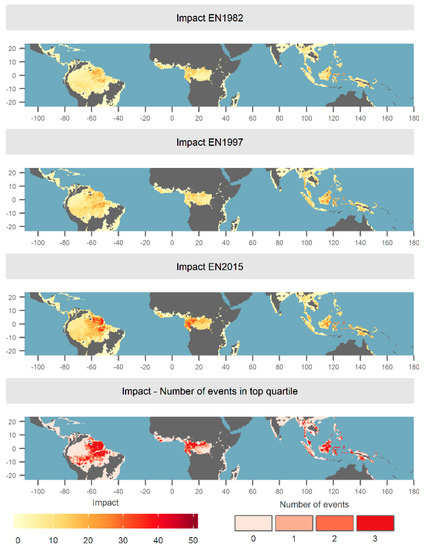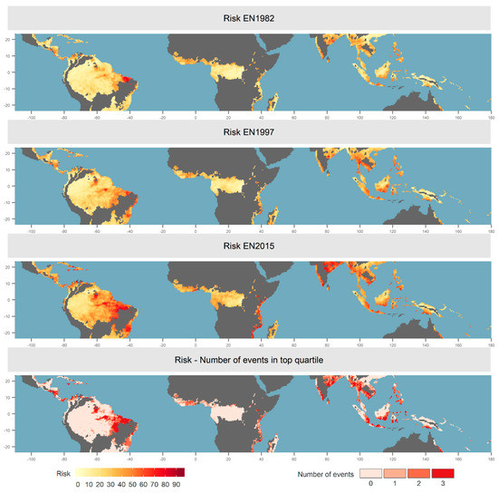 Impact of El Niños on the tropical forest carbon cycle. The top three panels show the distribution of impact in each El Niño, i.e., risk weighted by forest cover and forest biomass from Reference [30]. The bottom map shows the temporal consistency of pixels that had high impact across El Niños, which was calculated as the total number of El Niños in which each pixel appeared in the top quartile of the impact score.