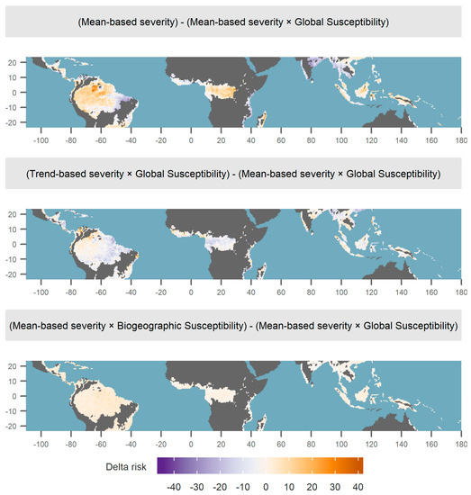 When comparing our risk map to other definitions of risk (Figure 5), the greatest difference was found between the risk definition that ignored baseline climate (mean-based severity, Figure 1a) and our main risk definition (Figure 1a,d). By ignoring baseline climate, the risk was overestimated in areas with lower values of susceptibility, such as the Western Amazon, and was underestimated in areas of high susceptibility, such as India (Figure 5). In ecological terms, ignoring baseline climate as a contributor to the response to climate anomalies is equivalent to considering forests to be strongly adapted to local climate so that a given climatic change will impact all trees across the tropics in the same way. Although local adaptations are a reality and physiological tolerances are known to reflect local climate [34], El Niño may create extreme hot and dry conditions outside of the tropical forest climate envelope [35].