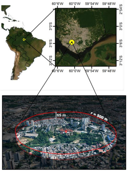 Manaus, Brazil, is located at the confluence of two large rivers, Rio Negro and Rio Solimões, in the forested Amazon Basin. It has a population of over two million and covers an area of 11.4 × 106 km2 [52]. The climatology of the accumulated precipitation and annual and monthly temperature of Manaus are around 2307.4 mm∙yr−1 and 26.7 °C, respectively [53]. The UAV flights were carried out on the campus of the School of Technology, Amazonas State University (3.0918° south (S), 60.0175° west (W)), in the central region of the city. The campus is surrounded by urbanized residential and commercial areas interspersed by forested areas (Figure 1). A view of local land cover around the flight location is also shown in Figure 1. There was a forested region directly around the launch site, which transitioned into urban residential and commercial areas. The maximum infrastructure height was 65 m in the radius of 500 m from the UAV launch site. Although no ground-level continuous ozone monitoring was conducted during the sampling period, ozone concentrations range from 0 to 40 ppbv in the wet season in urban Manaus. The highest concentrations occur around noon, and the lowest concentrations are at night.