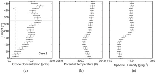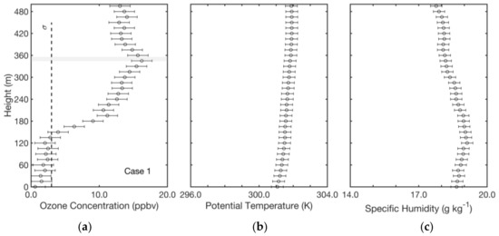 Figure 4a shows that, for case 1 of a stratified atmosphere, the ozone concentration typically changed by 10 ppbv across the top of the NBL, based on the analysis of individual flights. For case 2 of a turbulent atmosphere, Figure 4b shows that the ozone concentration smoothly evolved with altitude across the NBL until reaching 10 to 15 ppbv, which is characteristic of the overlying atmosphere. Other profiles were more complex with characteristics of both stratified and turbulent atmospheres, and these complex cases were designated as “case 3”. Vertical profiles corresponding to case 3 are plotted in Figure S1 (Supplementary Materials).