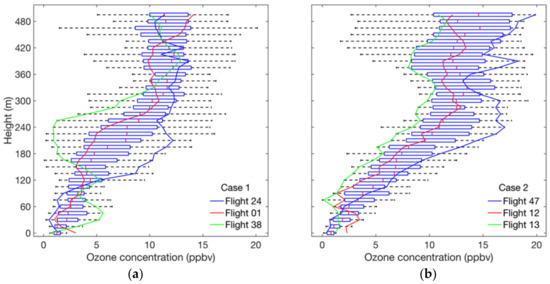 Profiles of ozone concentration for cases 1 and 2 of all flights are presented in statistical form in panels (a) and (b) of Figure 4. Horizontal box–whisker statistical plots are shown for selected altitudes from surface to 500 m. Example vertical profiles of ozone concentration for individual flights selected to envelope the statistical representation, as well as go through its center, are also shown.