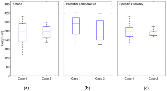 Box–whisker statistics plots of the height of the NBL during the wet season of 2018 based on (a) ozone concentration, (b) potential temperature, and (c) specific humidity for case 1 of a stratified atmosphere and case 2 of a turbulent atmosphere. Cases 1 and 2 correspond to 23 and 16 ozone profiles, respectively. For each box–whisker plot, the median (red line) of the combined datasets, quartiles (blue box edges), and the minimum and maximum values (black lines) are represented, excluding outliers.