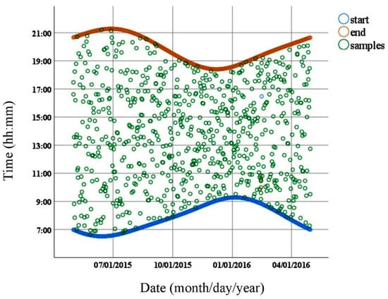 The images were selected from 2015 to 2016 to cover the entire year in order to test the universality of the algorithms for the four seasons and different times. According to the standard of two images per day, 730 images were randomly selected by generating uniform random numbers corresponding to the running time of the machine. Figure 1 shows the time distribution of the selected images. The horizontal axis indicates the date of image generation, while the vertical axis represents the time of image acquisition. The blue curve consists of many blue circles representing the start time of the device, and the red curve consists of red circles indicating the end of the device operation. The samples are shown by green circles demonstrating the uniform distribution of the samples. The scattered and fixedly positioned 18 image patches in each image were selected. These patches were manually labeled as clouds or clear skies by specialists, which were regarded as the ground truth to evaluate the detection performance.