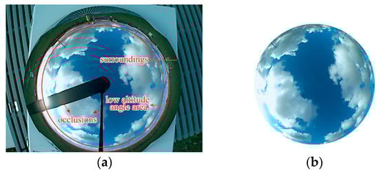 The sky images were preprocessed. An image consists of the sky region and the rest of the image. The sky region is the region of interest of the image, while the rest of the image is redundant. The rest of the image, including the surroundings, the low altitude angle area in the sky, and occlusions caused by the device itself, were removed for more accurate and rapid cloud detection (see Figure 2a). First, the region located in the available field of view was intercepted, eliminating the first two redundancies. Then, the occlusions were positioned and repaired by algorithms, which was done by other members of the team. After the preprocessing, only the sky region used for cloud detection remained, as shown in Figure 2b.