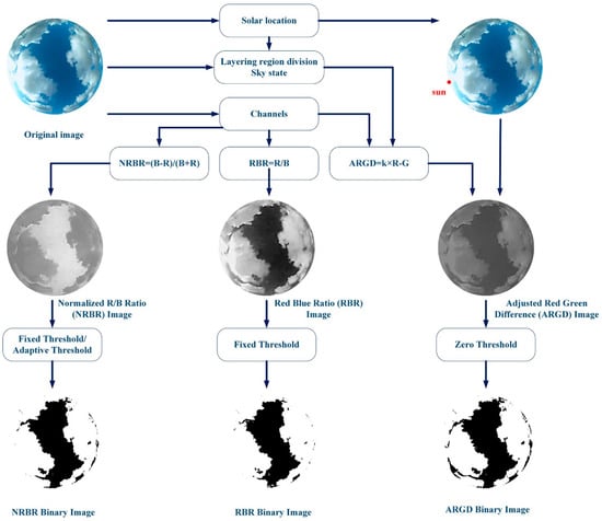The cloud detection algorithm is illustrated in detail in Figure 3. First, the solar location method is described to track the sun in the image used for feature calculation, which was suitable for the case where the images were taken from the platform and camera calibration using the OcamCalib software toolbox was not possible []. Then, the layering region division and the sky state used to determine the red weight in the feature are presented. Next, the ARGD feature used to reduce sunlight interference is introduced. Finally, the pixel identification, based on a zero threshold, is described. To illustrate the performance of the proposed feature, ARGD was compared with classical features such as NRBR and RBR. We noted that the three features use RGB channels. Fixed thresholding and adaptive thresholding are popular methods of images segmentation, while zero threshold is applied to ARGD feature images.