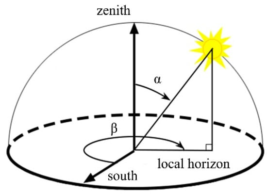 The celestial coordinate system divides the sky into two hemispheres: The upper hemisphere, where the objects above the horizon are visible, and the lower hemisphere, where the objects below the horizon cannot be seen. The pole of the upper hemisphere is called the zenith. A celestial coordinate system is a horizontal coordinate system that uses the observer’s local horizon as the fundamental plane. The spatial position of an object is expressed in terms of horizontal coordinates including SZA and SAA. Figure 4 visually shows the position of the sun in the horizontal coordinate system, where α is the SZA representing the angle between the zenith and the center of the solar disk, and β is the SAA meaning the angle of relative direction of the sun along the local horizon. The units of SZA and SAA, expressed as floating-point numbers retaining 15 significant digits, are degrees. The SZA with the range of (0°, 180°) was measured toward the ground with the zenith as the reference, and the SAA with the range of (0°, 360°) was increased clockwise from the south. The SZA was calculated from the date (year, month, day), time (hour, minute, and second), and the latitude and longitude: