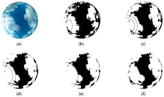The practical example of cloud detection is shown in Figure 7. The sky image is shown in Figure 7a. The sky state determined the sunlight interference by calculating SI and SD, and the weight was determined accordingly. Figure 7b shows the detection result when the weight has a constant value of 1.3, and the result in the first layer was adopted. Figure 7c,d show the detection results when weights were set to constant values of 1.4 and 1.5. The results of the ring regions in the second and third layers were adopted. Figure 7e shows the detection result when the weight was set to a constant value of 1.7, and the results of the remaining areas were adopted. Figure 7f shows the final detection result of the ARGD feature under zero threshold. As observed from the results of the processing, the amount of identified clouds increased with increasing weight. The increased amount of clouds was incorrect in the circumsolar region with sunlight interference, but the clouds with the correct identification in this area were added, proving that this feature is reasonable.